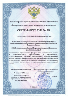The ATC lifetime certificate # 31 of February 1, 2019 confirms the right to conduct programs of initial training and retraining of pilots for Robinson R44 / R66 light helicopters, and retraining for EC130 T2, AS350 B3, Bell 407 helicopters.